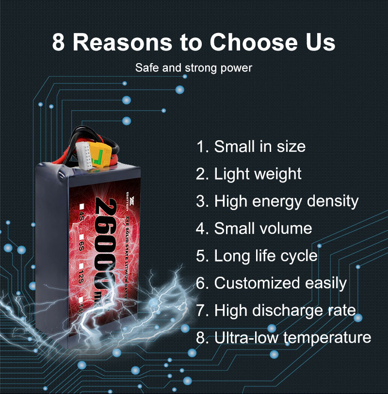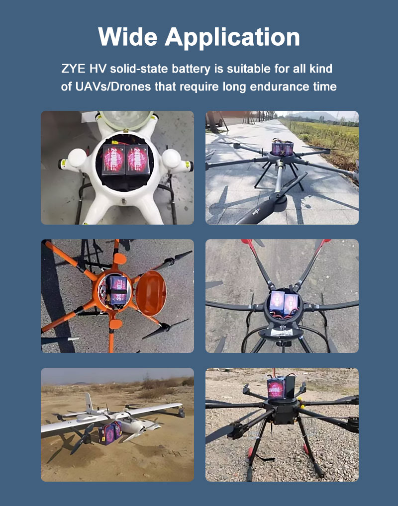 Najnowocześniejsza technologia: nasze baterie w stanie stałym reprezentują najnowsze postępy w technologii akumulatorów, oferując doskonałą wydajność i bezpieczeństwo, w tymWysoka gęstość energii 22AH 20AH 22000 mAh 10c 20c stały stały akumulator litowo-jonowy dla dronów dalekiego zasięgu.